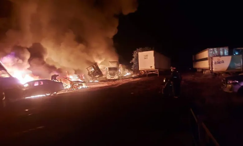 Mazatlán, Sinaloa.– Un fuerte incendio registrado la noche del domingo en una pensión vehicular ubicada en la sindicatura de Villa Unión dejó como saldo dos personas gravemente lesionadas y más de un centenar de vehículos consumidos por el fuego.