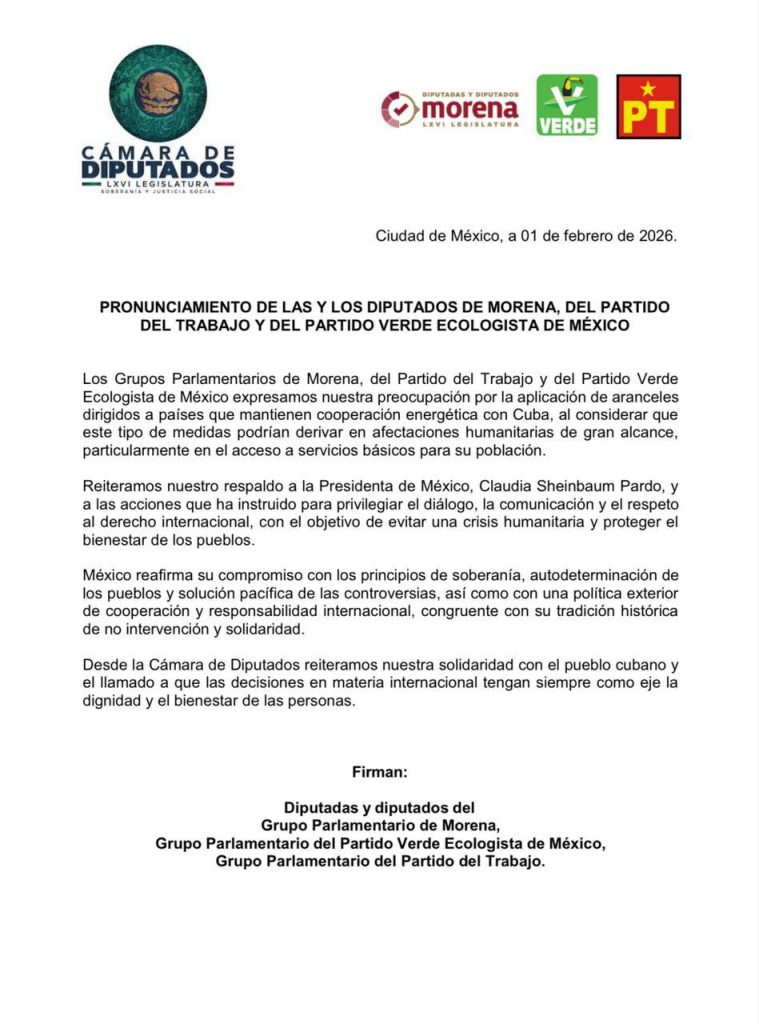 El posicionamiento se enmarca en el pronunciamiento conjunto de los grupos parlamentarios de Morena, Partido del Trabajo y Partido Verde, quienes desde la Cámara de Diputados refrendaron su respaldo a las acciones del Ejecutivo federal orientadas a preservar la cooperación y el diálogo entre naciones.